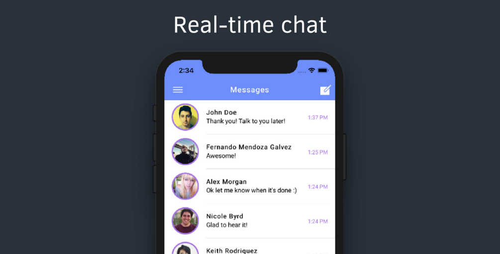 IonChat is a starter designed for chat based apps. It includes a backend developed with Node.js, Express, Parse Server + Live Queries and MongoDB.